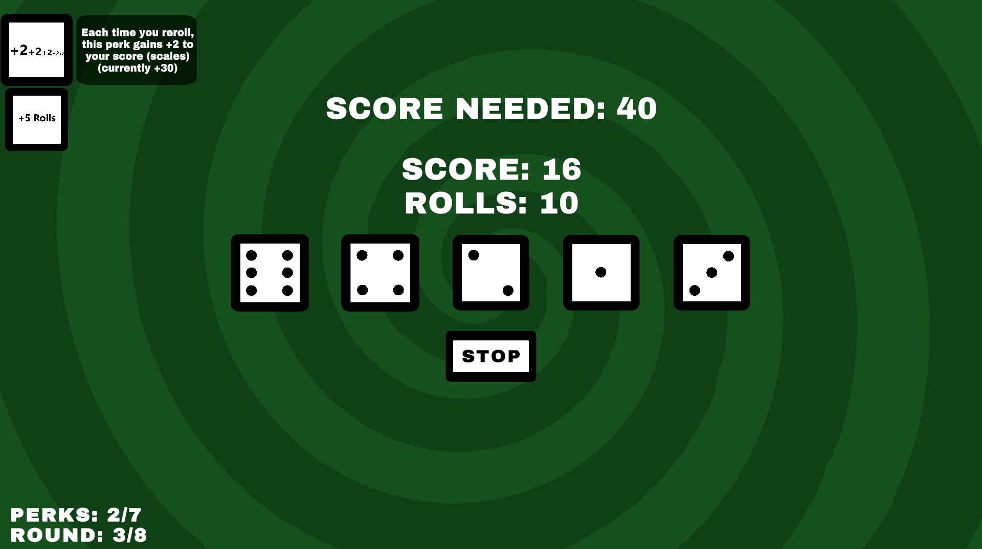 ROLL THE DICE TO BEAT THE REQUIRED SCORE IN THIS BALATRO-LIKE DICE ROLLING ROGUELIKE! ENTER THE SHOP AFTER EACH ROUND TO OBTAIN POWERFUL PERKS THAT WILL EXTEND YOUR RUN!